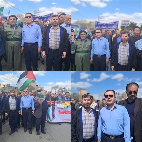 راهپیمایی روز قدس ساعت 10 و نیم از میدان ولایت فقیه با شعارهای کوبنده مردم همیشه در صحنه شهرستان ارومیه علیه استکبار جهانی در امتداد خیابان شهید منتظری شروع و با قرائت قطعنامه و سخنرانی در مصلای بزرگ امام خمینی(ره) شهرستان خاتمه یافت.